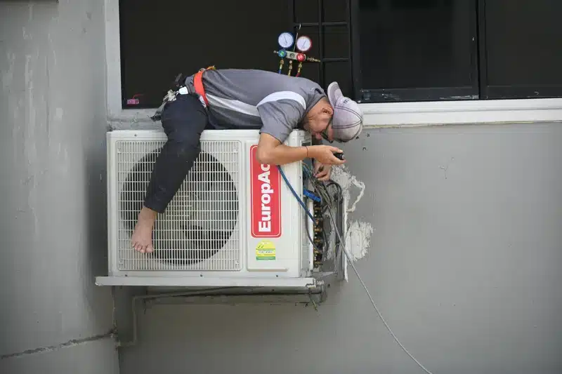 Technician dangerously balancing on outdoor air conditioning unit while repairing wires and gauges, highlighting risks of DIY HVAC fixes.