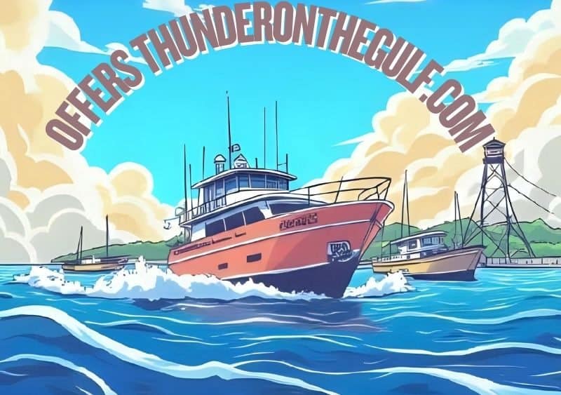 Illustration of a red offshore boat speeding across blue ocean waves with a dock and smaller boats in the background; large curved text above reads “Offers ThunderOnTheGulf.com,” promoting travel, local, and lifestyle savings.